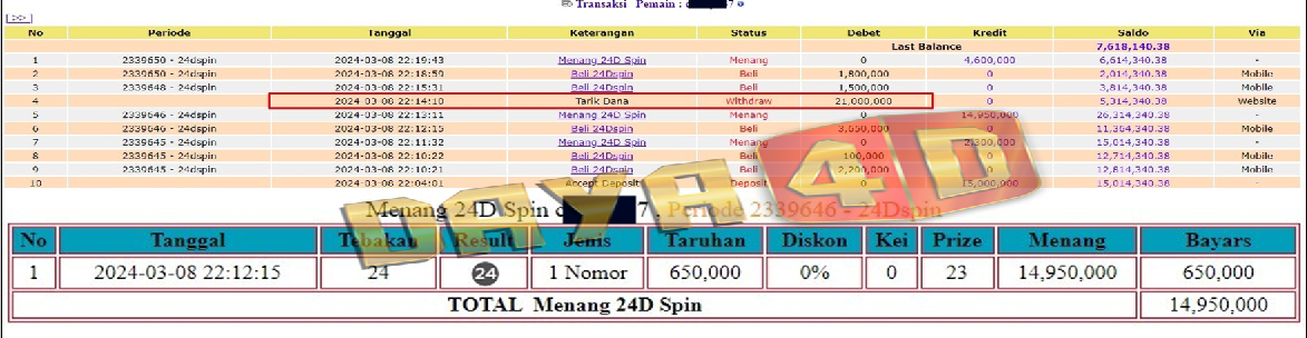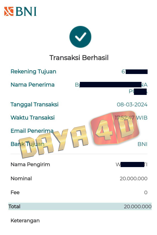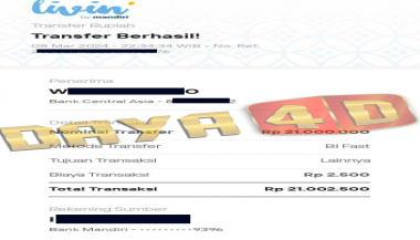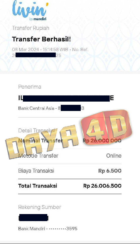 Selamat datang di situs resmi bukti transfer jacktpo DAYA4D. Ini adalah sebagai salah satu bukti kami merupakan bandar togel terpercaya maka kami akan selalu mengupload setiap bukti transaksi transfer kemenangan para member kami melalui situs ini.
