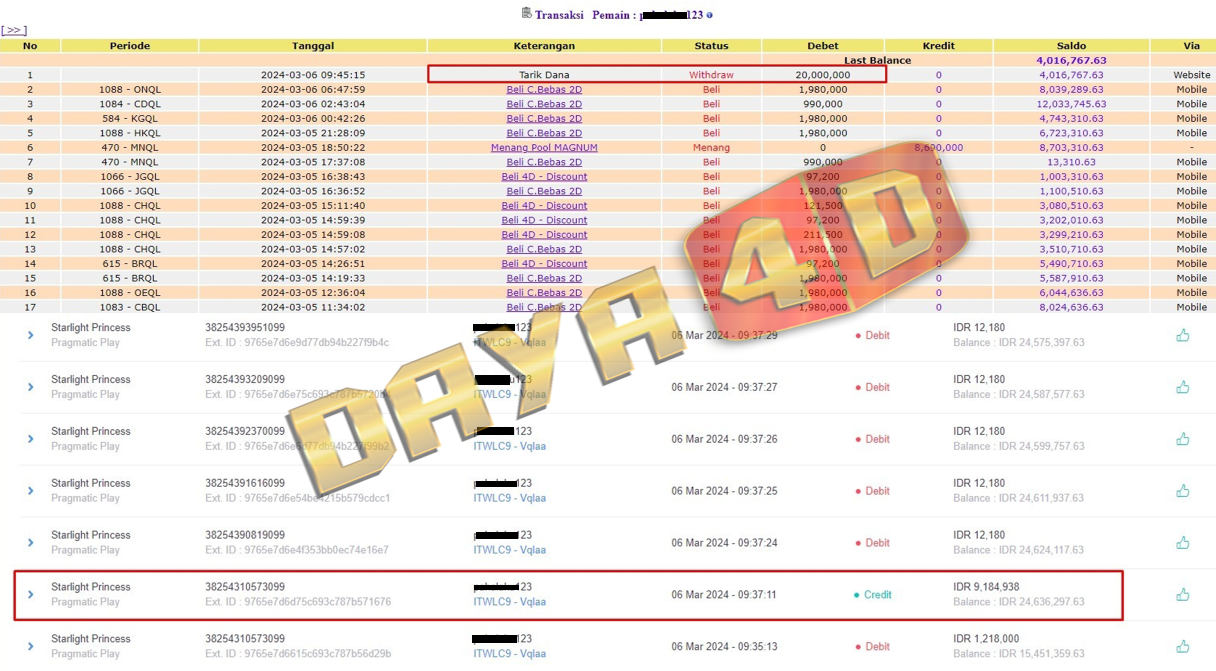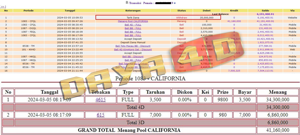 Selamat datang di situs resmi bukti transfer jacktpo DAYA4D. Ini adalah sebagai salah satu bukti kami merupakan bandar togel terpercaya maka kami akan selalu mengupload setiap bukti transaksi transfer kemenangan para member kami melalui situs ini.